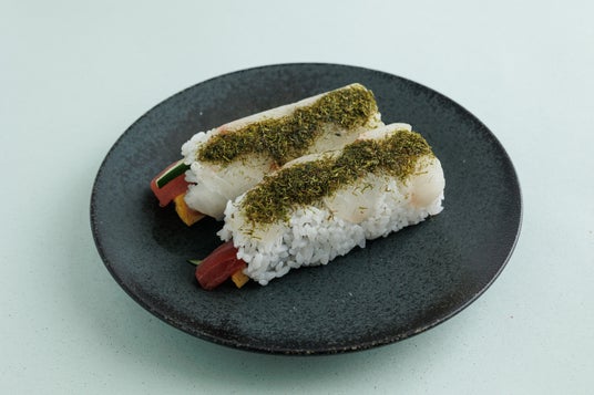 ROLL鮨をメインに、定番の江戸前鮨などを提供する<スシアベニューK’s>。真鯛にすじ青のりをふんだんにトッピングし、インパクト抜群です。巻鮨の中にはポン酢ジュレを入れて巻き込んであり、さっぱりとお召し上がりいただけます。