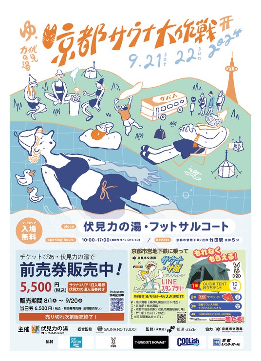 参加費: 〈サウナエリア〉前売り券5,500円/当日券6,500円(税込み) (伏見力の湯入浴料込み・アウフグース別途有料) ※前売り券が完売した場合、会場での当日券の販売は御座いません。