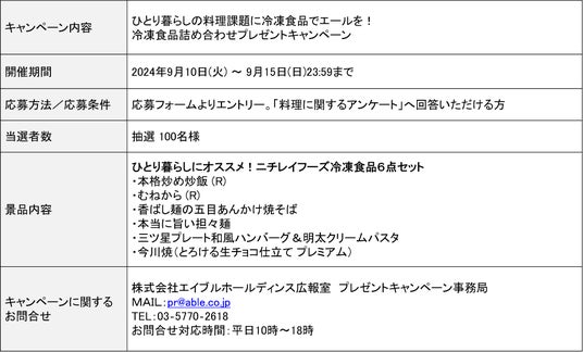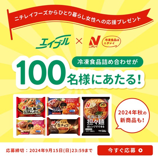 株式会社エイブル(本社:東京都港区、代表取締役社長:吉田晴雄、以下「エイブル」)は、株式会社ニチレイフーズ(本社:東京都中央区、代表取締役社長:竹永雅彦、以下「ニチレイフーズ」)と“ひとり暮らしの料理課題に冷凍食品でエールを!”をコンセプトに、エイブルが展開するひとり暮らし女性応援サービス「MAISON ABLE(メゾンエイブル)」で冷凍食品のプレゼントキャンペーンによるコラボレーション企画を開催いたします。