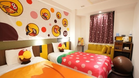 森永製菓は「変なホテル」が持つ魅力を、お菓子の持つワクワク感でさらに引き立たせるため、客室空間コンサルティングを始め宿泊価値向上に関するあらゆる支援をパートナーとして行いました。例えば、ターゲット(世代を超えたシティーホテル利用のお客様)の明確化や、客室コンセプト(変なホテルならではのワクワク感)をチェックインからチェックアウト、さらにその後の帰路に至るまで感じていただけるよう、チョコボールの「キョロちゃん」を活用した客室のデザインや、お菓子を活用したアクティビティの提案等を行いました。