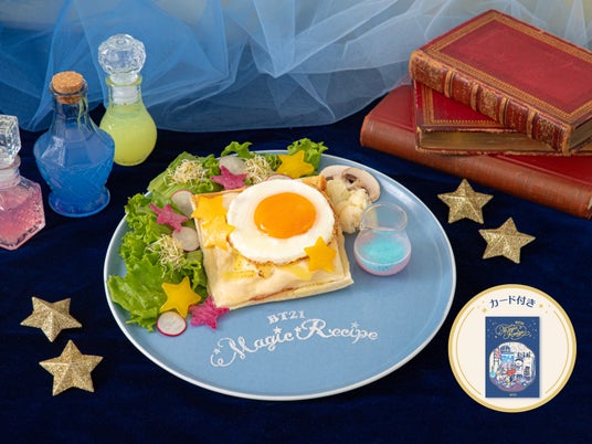 BT21の仲間たちのレシピをイメージしたキラキラした7種のドリンクが登場します。星形のナタデココやお好みでスパイスをトッピングして完成させる楽しいドリンクメニュー、それぞれBT21の仲間たちのステンシルをセレクトできる魔法の帽子型のごはんに魔法の鍋に入ったカレーをかけて食する魔法のワンプレート、ハムなどの具材に目玉焼きがのったクロックマダム、お好みで別添えの爽やかなトマトソースで味変も出来るホワイトクリームのスパゲティーグラタンなどのフードメニュー、わたあめがトッピングされたパンケーキや星のチョコステッキがトッピングされたパフェなどカラフルでフォトジェニックなメニューをご用意いたしました。