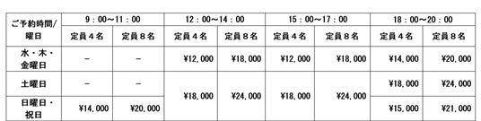 1.9:00~11:00(日曜・祝日のみ) 2.12:00~14:00 3.15:00~17:00 4.18:00~20:00