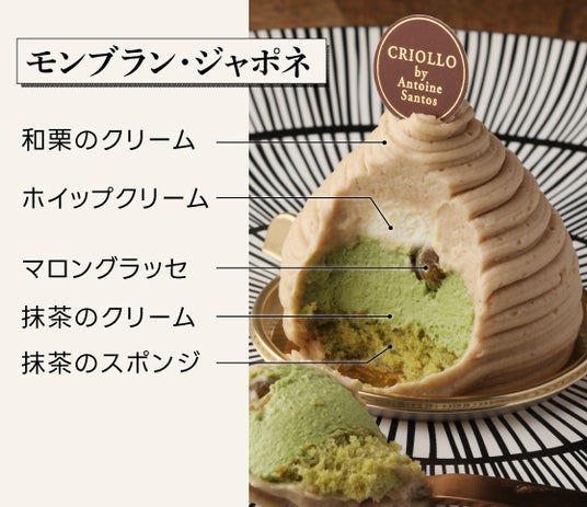 上質な和栗のクリームの中には、深い味わいの抹茶のクリーム。中には刻んだマロングラッセや抹茶のスポンジ生地を合わせ、和素材の良さを存分に楽しめるお味に仕上げました。