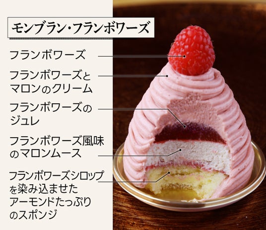 クリーミーで濃厚ながら優しいマロンのお味に、サントスシェフが合わせたのはフランボワーズ。フランボワーズのほんのりとした甘酸っぱさと、栗のほどよい甘さが相性抜群です。中にはフランボワーズのジュレも入って、見た目だけでなくお味も華やか!