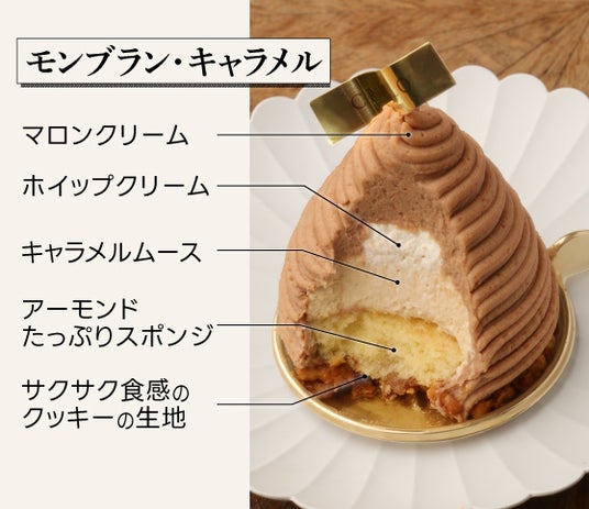 濃厚でコクのあるマロンクリームの中に、滑らかなキャラメルムースを合わせました。下にはサクサクとしたクッキー生地や、アーモンドたっぷりのスポンジ。一口で様々な食感が楽しめる、サントスシェフのこだわりが詰まった逸品。