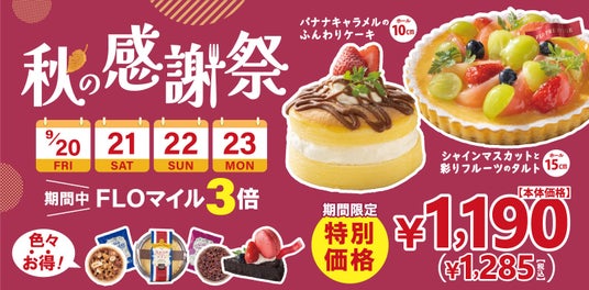 関東を中心に洋菓子・洋惣菜のテイクアウトショップ121店舗(2024年8月末現在)を展開する株式会社フロジャポン(本社:東京都武蔵野市)が運営するフロプレステージュでは、日頃のご愛顧に感謝し、2024年9月20日(金)~23日(月)の4日間限定で、今年もお買い得商品を多数ラインナップした「秋の感謝祭」を開催いたします。開催期間中は、FLOマイルもなんと\3倍/に!