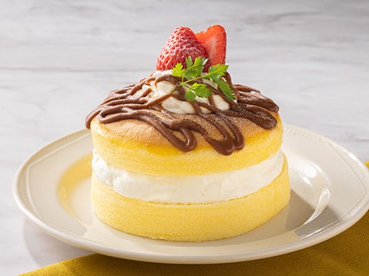 しっとりふわふわ食感のスポンジに、バナナとマスカルポーネクリームをサンドし、マスカルポーネクリーム・キャラメルソース・苺でデコレーションしました。