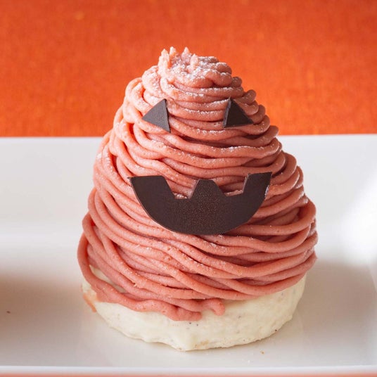 細かく刻んだマロングラッセと、甘酸っぱいベリージュレの入った生クリームをベースに、周りにフルーティーなルビーチョコレートを加えたマロンクリームを絞りました。チョコレートで表情をつけて、ピンク色のオバケモンブランに!