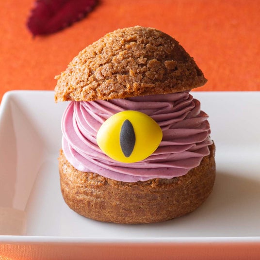 ビターなチョコカスタードクリームと、爽やかな酸味のカシスクリームを纏ったモンスターシュークリーム。中心にはサワークリームが潜み、さっぱりとしたアクセント。頬張ると目が合うかも?!