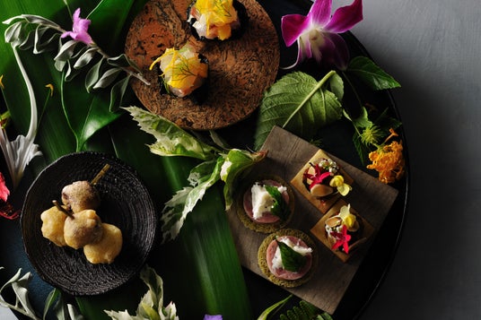 1日目夕食「琉球ガストロノミア~Bellezza~」 島こしょうと呼ばれる「ピパーチ」がアクセントのカリフラワーと紅芋のフリットなど、健やかな美へ導く全9品のコース料理