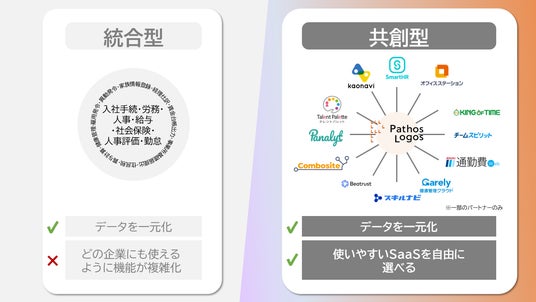 「PathosLogos」は、長年の人事業務に関するノウハウを集約し、「人」に関するデータを標準化しデータベースとして保持するサービスであり、機能レベルで各SaaSとデータ連携することが可能です。