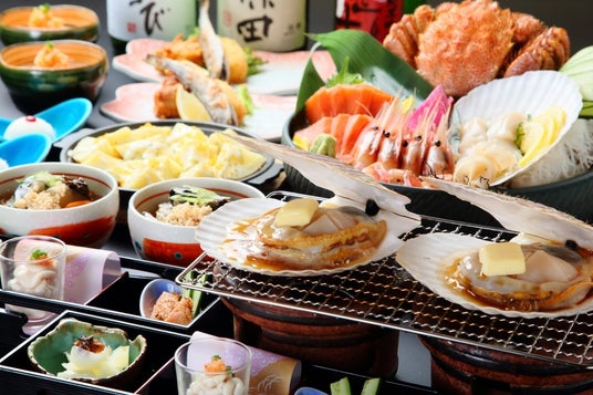 昼時は北海道の旬食材を使った「定食」と「和の甘味」を、夜は各地の漁港から直送される新鮮な魚貝料理や山の幸など、北海道の旬料理を揃えております。