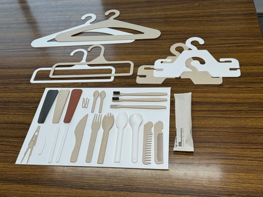 左/紙製靴べら 右上/紙製コーム 右下/紙製歯ブラシ