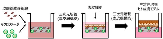 技術的に難しいとされていた、分化させたマクロファージを3D培養ヒト皮膚モデルの構造を壊すことなく組み込むことに世界で初めて成功