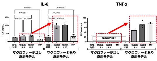 ? マクロファージを組み込んでいない3D培養ヒト皮膚モデルと比較して、マクロファージを組み込んだ皮膚モデルでは、LPSまたはMPの添加24時間後の培養上清中に炎症性サイトカイン類の放出がIL-6は約3倍、TNFαは顕著に上昇することが認められました(図2)。このことから、マクロファージを組み込んだ皮膚モデルが炎症応答を評価できることが分かりました。