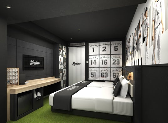 部屋一面に敷かれたグリーンのカーペットは、まるでZOZOマリンスタジアムに入場したかのような高揚感を感じることが出来ます。球場で感じる興奮とは一味違う、思わず写真を撮影してしまいたくなる遊び心溢れるお部屋になっています。