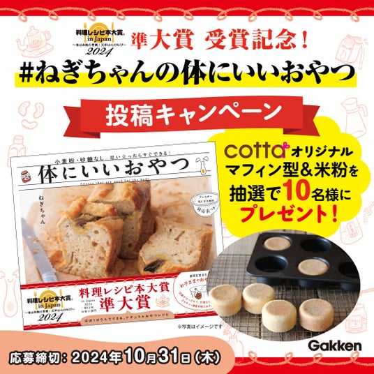 今回の受賞を記念し、ねぎちゃん(@___negi_chan)レシピの「作ってみた投稿」をInstagramで募集いたします。ご投稿いただいた方のなかから抽選で、日本最大級のお菓子作り専門サイト・cottaさんオリジナル「マフィン型」と「米粉」をセットで10名様にプレゼントいたします。