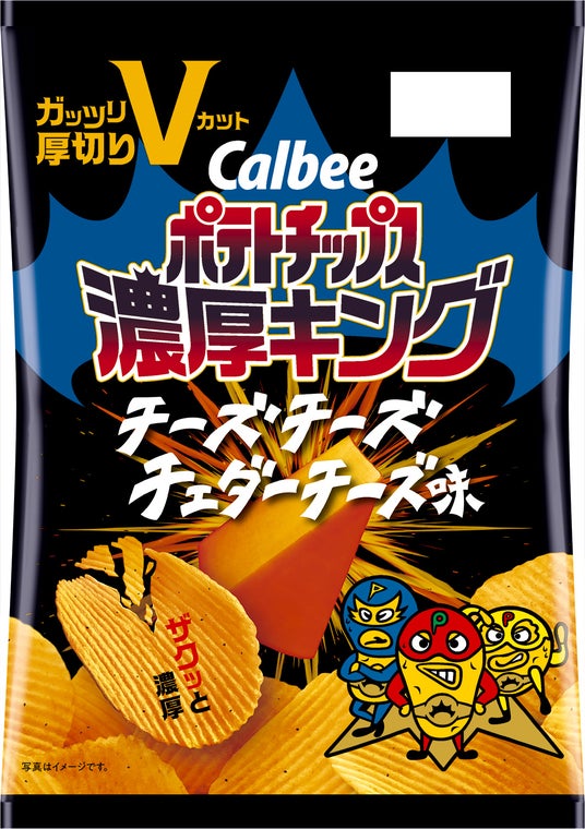 『ポテトチップス濃厚キング チーズチーズチェダーチーズ味』は、「ポテトチップス濃厚キング」シリーズの4品目として発売する商品で、近年スナック菓子のフレーバーとして好調なチーズ味です。口に入れたとたんに押し寄せる濃厚なチーズの味わいを楽しめます。こだわりのスパイスを加えることで、ただ濃いだけではなく、深みを感じるチーズ味を実現しました。これまでの「ポテトチップス濃厚キング」は「カルビー ポテトチップス」と同じ“フラットカット”でしたが、今回は初めて“厚切りVカット”を採用。当商品のチーズフレーバーと相性がよく、ザクッとした満足感のある食感を楽しんでいただけます。