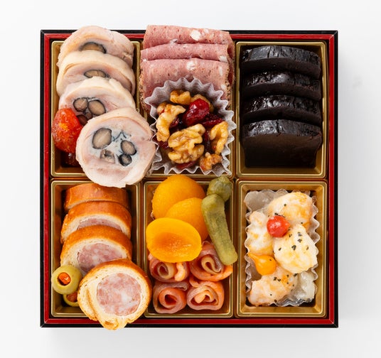 与の重 <全14品>チキンガランティン、ドライトマト赤ワイン煮、ソーセージトゥールーズのブリオッシュ包み、スタフドオリーブ、ビーフパストラミ、クランベリークルミ、杏子さわやか煮、スモークサーモン、コルニッションピクルス、ショコラテリーヌ、玉ねぎマリネ、ロブスターのホワイトソース和え、ペッパードロップ、イエローペッパードロップ