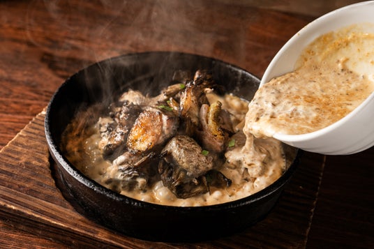 香り豊かな刻みマッシュルーム、歯ごたえが良い黒舞茸の2種のきのこをメインに、トリュフパウダーを隠し味に加えた特製クリームソースに仕上げました。 アツアツの鉄板に乗った地鶏に卓上でソースをかけた瞬間にソースの香りがジュワッと広がります。