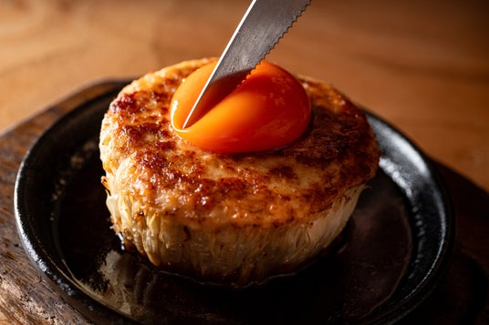 大きなえのきの切り株に地鶏のつくねを乗せてどーんとステーキに。こだわり卵の「塚だま」を乗せ、地鶏つくねのジューシー旨味と、加藤えのき独特のシャキシャキ感と甘みがクセになる味わい。