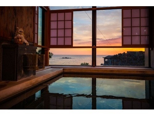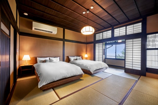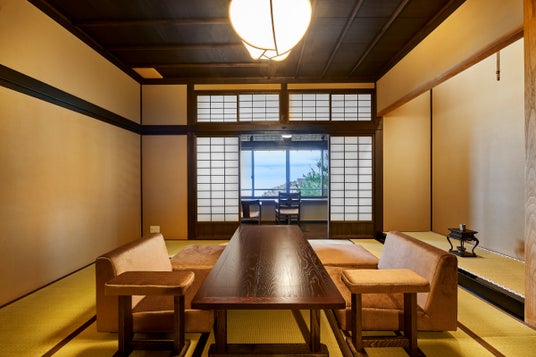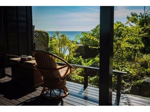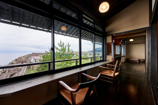 眺望の良い2階の2室をつなげた、ゆったりとした広さの特別室「くちなし Kuchinashi」。眼下に広がる日本海を眺めながら、おしゃべりや読書をしておくつろぎください。