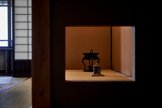 日本家屋の凛とした雰囲気を大切に、床の間には越前焼の香炉、古材をアップサイクルしたサイドテーブルを設えました。