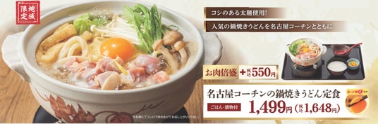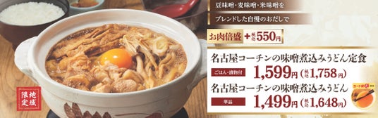 ※上記メニューの「名古屋コーチンの鍋焼きうどん定食」は、愛知県・岐阜県・三重県の一部、静岡県の一部店舗では販売しておりません。同エリアでは「名古屋コーチンの味噌煮込みうどん定食」を販売します。