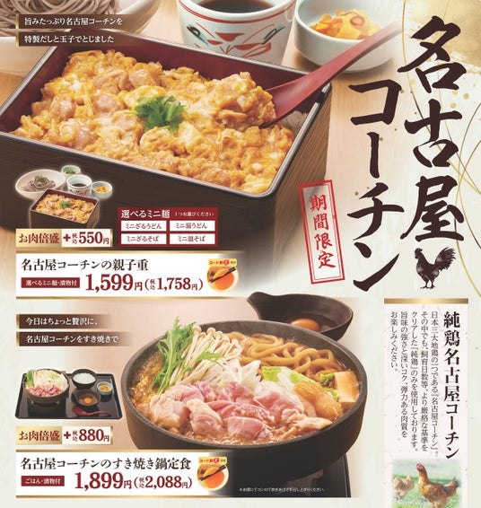 今回のフェアでは、鶏がらと醤油ベースの特製だしを使用した「名古屋コーチンの親子重」1,599円(税込1,758円)や、特製の割り下ですき焼き風に楽しむ「名古屋コーチンのすき焼き鍋定食」1,899円(税込2,088円)などを販売します。