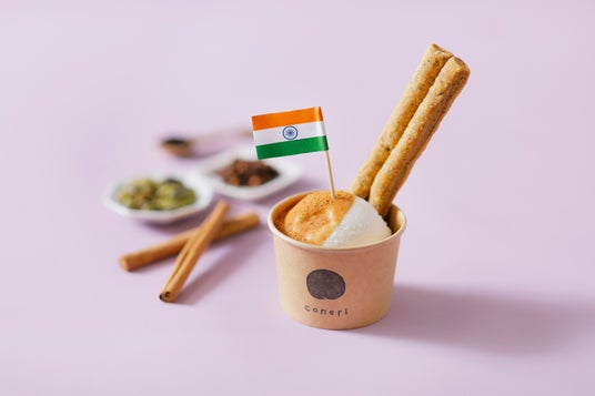 chibeta 各¥500 (MILK / SOY) なめらか食感のオリジナルジェラートに特製チャイソースとシナモンシュガー、マサラチャイのスティックパイをトッピングしました。ミルクとソイのどちらか、お好きなジェラートを選べます。チャイソースはセイロンティーベースにカルダ