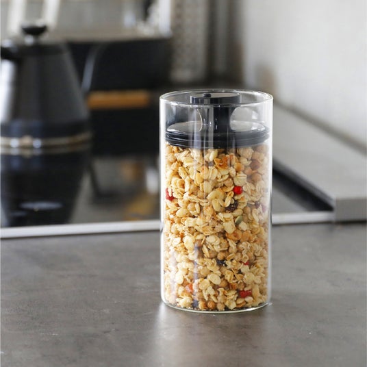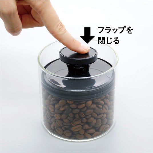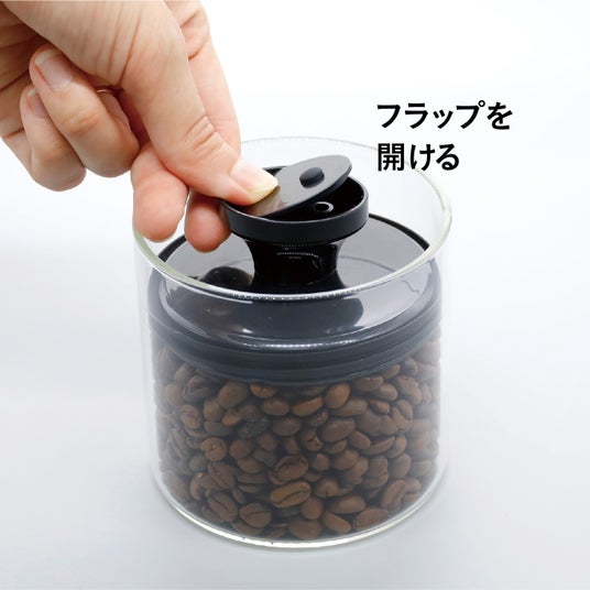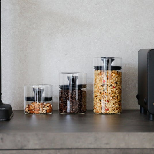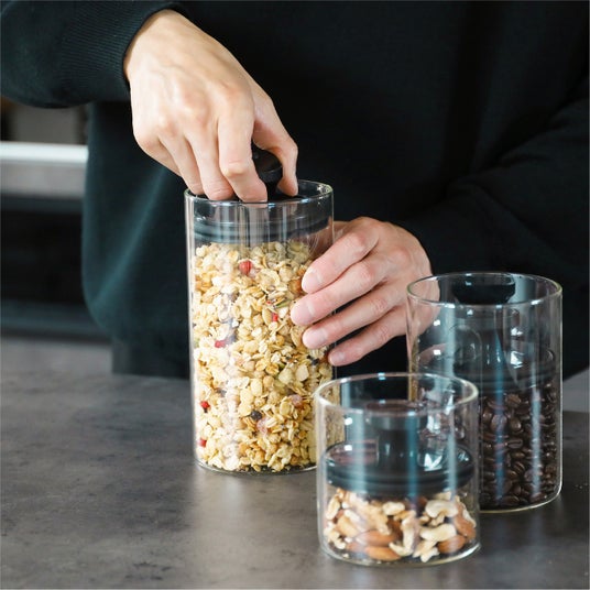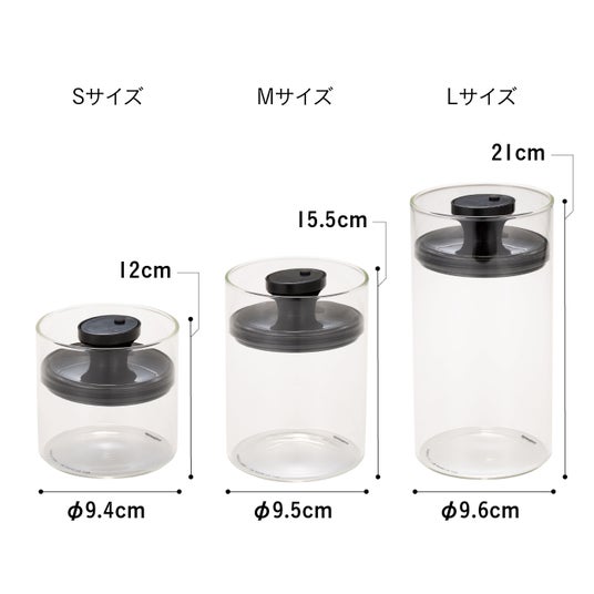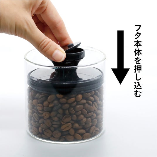 フタを食材に密着するまで押し込むことで、余分な空気を抜いて食材を酸化から守り痛みにくくしてくれる『耐熱ガラスキャニスター S/M/L』。