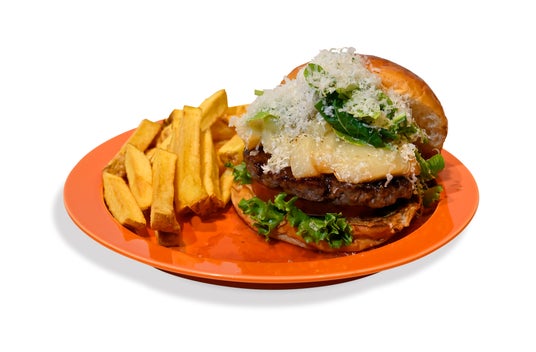 桃の甘さがパティの旨みを絶妙に引き立て、さらにルッコラの風味とパルミジャーノのコクが味わいに深みを加えます。