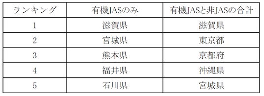 表.有機農地面積(耕地面積に対する割合)による都道府県ランキング(田の場合)※有機JASは「田」、非JASは「水稲」として集計されたデータを用いている 出所:農水省データ、楠田(2023)を基に坂ノ途中が作成