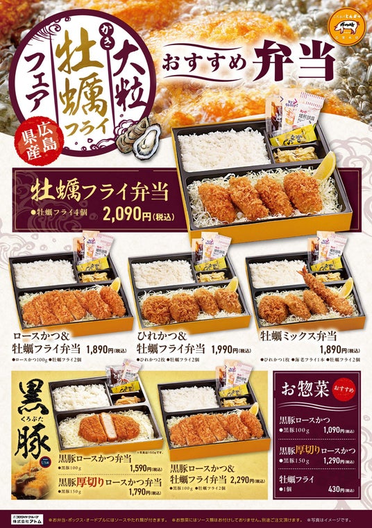 大粒牡蠣フライフェアのおすすめ弁当も充実しております。テイクアウトでもかつ時自慢のお料理をお楽しみ頂けます。