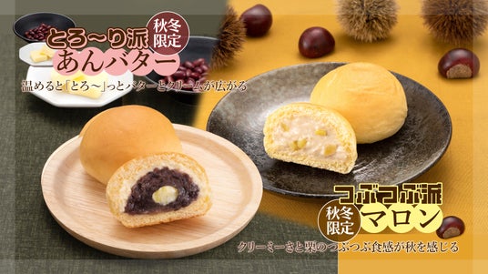 両フレーバーは、八天堂オンラインショップで毎年秋冬に販売している季節限定フレーバーです。「マロン」はマロンクリームの中にマロンダイスを入れ、優しいマロンの風味とつぶつぶした食感をお楽しみいただけます。「あんバター」は八天堂特製のクリームとあんこ、バターを入れた、あまじょっぱさが特長のくりーむパンです。