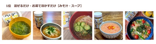 本企画は「火を使わない料理につぶみそを使う」ことをテーマとしており、投稿が多く集まったカテゴリTOP3は「スープ・味噌汁」「サラダ・和え物」「おにぎり・ごはん」となりました。電気やガスを使えない災害時であっても火を使わずにいつもの味を食べることができるといった「つぶみそ」の特性が際立ちました。