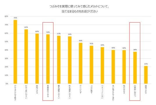トライアル後のアンケートでは、49%が「常備したい」、40%が「ときどき買いたい」と回答し、約90%の人が購入意向を示す結果となりました。また、「つぶみそ」のメリットについて、「かけるだけの手軽さ」(76%)、「片手で使いやすい」(65%)、「時短できる」(60%)、「量を調整しやすい」(57%)、といった日常使いでの手軽さを評価する声に加えて、「長期保存できる」(59%)、「災害時に役立つ」(38%)といった防災面の有用性を評価する声も多く集まりました。