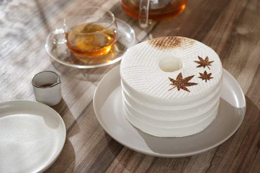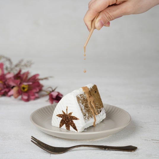 たっぷりのクリームで覆われた天面には、紅茶パウダーで秋風の下ひらひらと躍る紅葉のステンシルを施しました。