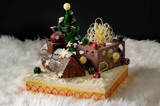 さらに、10セット限定の「Ho! Ho! Ho! ~あわてんぼうのサンタクロース~」は、サンタクロースがプレゼントをお家に届ける際に足を滑らせて煙突に突っ込んでしまったストーリーを表現したユーモア溢れるシェフの自信作です。大人数でのパーティーにふさわしい華やかなフレジェには、イタリア産ピスタチオのプラリネを使用。さらにその上に、ライチゼリーとグロゼイユを包んだ自家製ピスタチオプラリネの濃厚ムースケーキをのせ、特大プレゼントをイメージしたチョコレート細工をかぶせることでアート感あふれる立体的な作品に仕上げました。