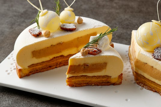 「ノエル・プラリネ」は真っ白なスノーマウンテンをイメージし、可愛らしい小人がクリスマスツリーに見立てたローズマリーを切りオーナメントを飾ろうとしている様子を表現。タルト生地の中に歯切れの良いヘーゼルナッツサンファリーヌとクレームアプリコットをたっぷりと詰め、その上にキャラメルのように濃厚で香ばしい自家製ヘーゼルナッツプラリネとなめらかなピーカンナッツのムースをエアリーなマスカルポーネムースで包んで重ねました。
