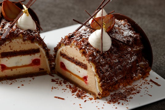 クリスマスの定番「ブッシュ・ド・ノエル」に見立てたケーキの表面には和栗のクリームと焼き栗シャンティを纏わせ、中には熊本県産和栗の優しい甘みと豊かな風味を引き立てる洋梨とマンゴーのジュレ、ベルガモットムース、チョコレートのビスキュイを忍ばせ、甘み、酸味、苦味の絶妙なバランスが織りなす栗尽くしのモンブランに仕上げました。王道モンブランの形にとらわれないシェフこだわりの一品です。