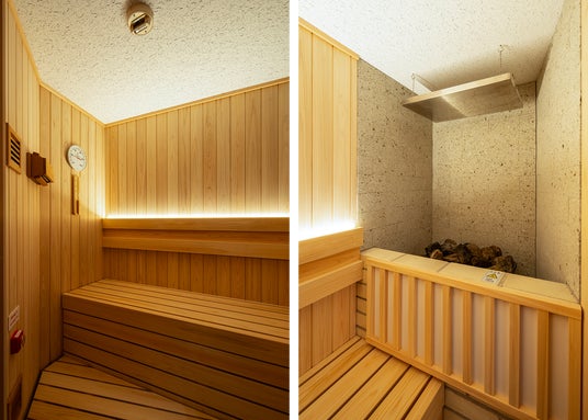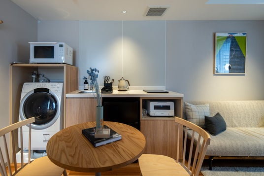 ホテル内には、より単価の高いホテルと同様の設備となるサウナとジムが併設されており、長期滞在時も健康的に過ごすことができます。また、客室内にはバスルーム、キッチン、ダイニングがあり、調理器具や洗濯機も完備され、ストレスなく快適に過ごすことができます。