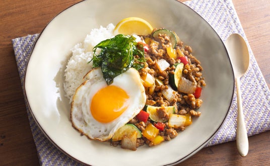 ごろっと野菜の本格ガパオ。アジアの魅力を存分に堪能できる一品です。スパイシーで香ばしい味わいをお楽しみください。