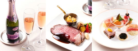 最上階に位置する天空のラウンジで煌びやかな眺望とともに味わう特別ディナー。乾杯のシャンパーニュから始まり、フォワグラのラビオリや和牛サーロインのローストビーフなどのお料理がお腹も心も満たします。