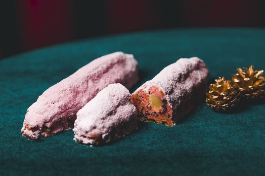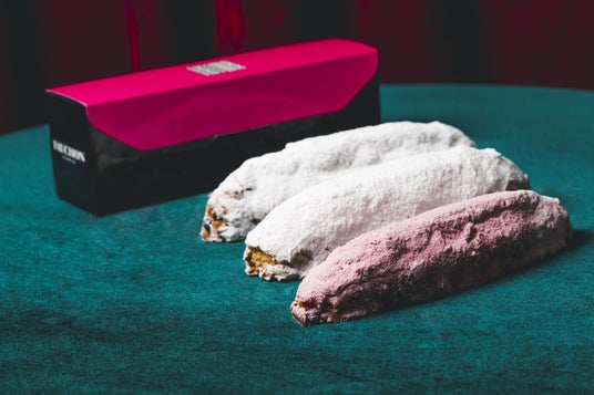 今年もお取り寄せ可能な「シュトーレン」は、オリジナル、柑橘フレーバー、ピンククランベリーの3種を展開いたします。オリジナルは毎年好評のクラシカルなレシピでお届け。サルタナレーズン、オレンジピール、レモンピール、アーモンド、シナモン、クローブ、ポワール(洋ナシ)、ピスタチオを洋酒(マール ゲヴェルツトラミネール)でしっかりと漬け込み、中にマジパンを入れて焼き上げることでクラシックな美味しさを追求しました。もう1種は京都産水尾のゆずや伊予間、甘夏、瀬戸内レモンなどを使った柑橘フレーバー。フルーツはフランスの薬草系リキュール、シャルトゥルーズで漬け込んで使用しています。そして今年は、ほのかなピンク色が可愛らしいクランベリーフレーバーが新たに登場。フォションピンクのシュトーレンが