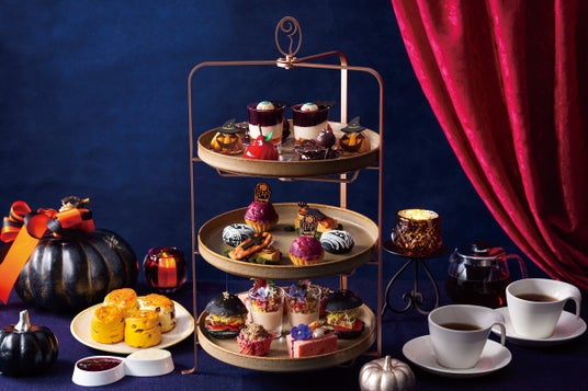 アフタヌーンティーでは、洋梨のコンポートとムースの上に目玉が目を引く「血走る目玉 赤ワインゼリーと洋梨のヴェリーヌ」や、タルト生地の上に生クリームを忍ばせ紫芋クリームを絞った「紫芋 脳みそモンブラン」、生地に竹炭を混ぜ込み中にチョコレートクリームを入れた「漆黒 お化けマカロン」など7種のスイーツをご用意いたします。またセイボリーには、ピクルスと玉ねぎなどを合わせスパイシーに仕上げダークな竹炭のバンズが目を引く「竹炭ミニバンズ 鮪のグリル アボカドレリッシュ」や、紫キャベツのシュークルートが肉の旨みを引き立たせる「パストラミビーフ 紫キャベツ ベリーブレッドサンド」など4種のセイボリーにもご注目ください。横浜元町 紅茶専門店「ラ・テイエール」のフレーバードティーをはじめとする10種以上のドリンクとあわせてお楽しみいただけます。
