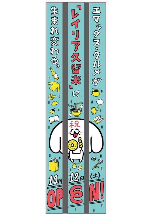 「レイリア久留米」のグランドオープンを祝して、様々なイベントを展開します。オープン初日は、午前10時から先着2,000名のお客さまに記念ノベルティを進呈するほか、10月18日(金)、19日(土)の2日間は、オープン記念プレミアム商品券を限定販売します。なお、9月17日からは、久留米市出身のクリエイター、パントビスコ氏がデザインした巨大懸垂幕を当ビル西側壁面に掲出し、「レイリア久留米」のオープニングに華を添えます。