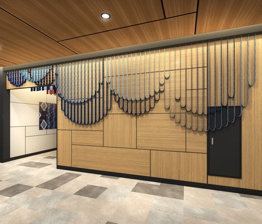 グランドオープンに合わせて、共用部の内装に重要無形文化財である”久留米絣”を随所に採用するほか、久留米絣をモチーフにした装飾を多数施すなど、久留米らしさを演出する意匠を取り入れます。また、東口広場には(一社)We Love久留米協議会と連携し、一息つけるベンチやスタンドを設置します。