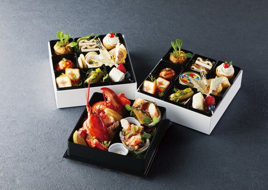 オークラ東京のスペシャリテが勢揃い。オマール海老、あわび、キャビア、フォワグラなどクリスマスの食卓を 彩るのにぴったりな豪華食材を使用し、スタイリッシュで華やかなオードブルに仕上げました。三段のお重に入っており、パーティーやギフトとしてお持ちいただくのにも最適です。
