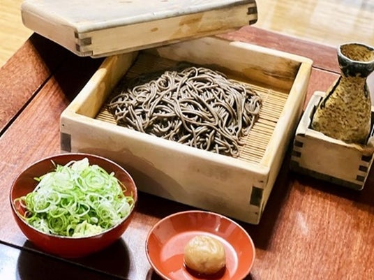 茹でたてを熱いまま盛る「あつもりそば」が名物。殻ごと挽いた蕎麦は褐色を帯び玄妙な味わい。